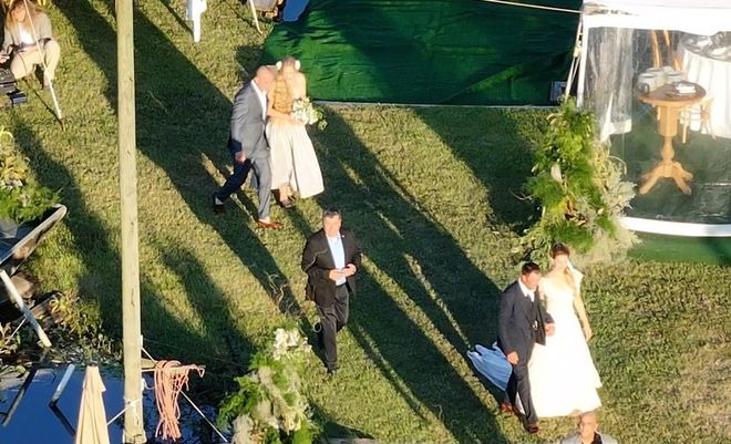 在被记者偷拍的画面中,打雷姐手捧花束,身着飘逸的白色婚纱,在她的父亲Robert Grant陪同下走过红毯,最后和鳄鱼男交换了誓言。