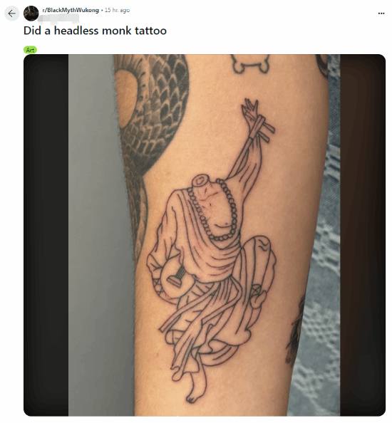 近日,Reddit上有国外玩家分享了自己的《黑神话》无头僧灵吉纹身,图案来自游戏中的影神图。