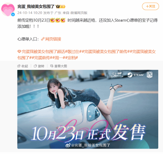 《完蛋!我被美女包围了!前传》将于10月23日正式发售。随着发售日临近,官方也是按捺不住,在微博开启预热,豪车美女相伴你爱了吗?感兴趣的小伙伴快把游戏加入Steam愿望单吧。