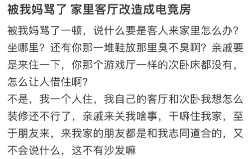 与此同时,也有网友反应自己想要将次卧甚至部分客厅空间打造电竞放的想法遭到家长的反对,家长大多以“客人来了没地方呆”予以反驳。