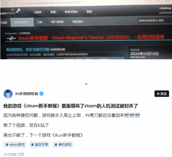 此前我们曾报道,国内玩家@86岁按时吃饭在社交平台发文,表示自己正在打造一款名为《Steam新手教程》的游戏,而且准备上架Steam。不幸的是,这款游戏最终未能上架成功。