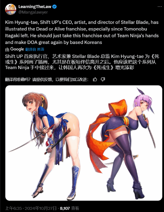 近日,Shift UP首席执行官,《剑星》总监Kim Hyung-tae为《死或生》系列画了插画,角色为身着性感忍者装的“霞”和“绫音”,引发网友们热议。