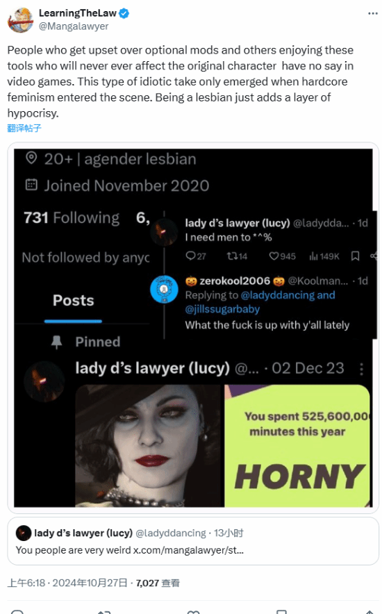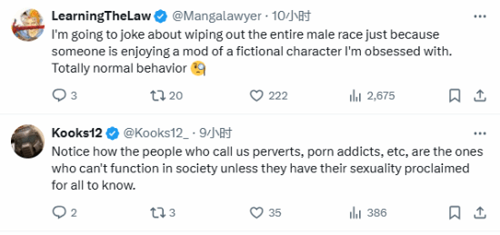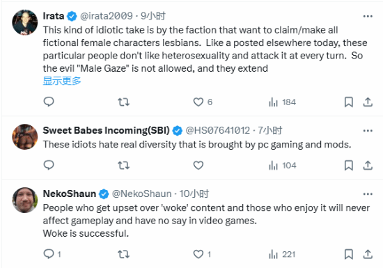 日前,推主Mangalawyer参与了这场骂战,并发推评价了此事,说道:“对于因其他玩家选用可选模组Mods而感到不悦,而这些Mod根本不会改变原始角色的人,他们在电子游戏领域根本就没有发言权,这种愚蠢的观点只有在硬核女权主义介入后才浮出水面,成为女同性恋者只是为这种虚伪增添了一层遮羞布。”
