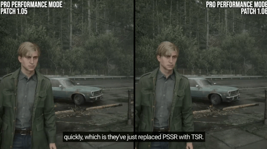 根据技术分析博主Digital Foundry的评测,这次补丁的确为游戏带来了显著的改进,并且使用了一些有趣的技术手段。具体来说,这次《寂静岭2》的补丁在性能模式中用TSR取代了PSSR(PS5 Pro的专属新型超采样技术)。也就是说,游戏不再使用PS5 Pro的专有超采样技术,而是采用了虚幻5内置的采样系统。