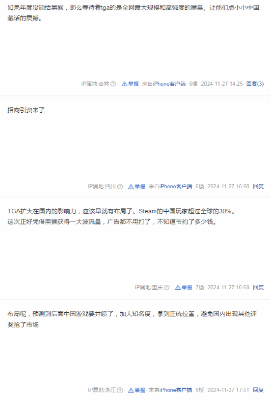 很多玩家认为,TGA之所以会在国内大规模宣传,是已经准备好把年度游戏颁给《黑神话:悟空》了,以此在中国提高品牌知名度和影响力。毕竟如果最后《黑神话》没得奖,数量庞大中国玩家肯定会把TGA骂的狗血淋头。