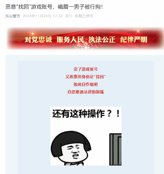 据乐山警方官方公众号,近日,峨眉山市公安局名山派出所破获一起“恶意找回游戏账号”案件,犯罪嫌疑人苟某550元卖出游戏账号,第二天就找回。