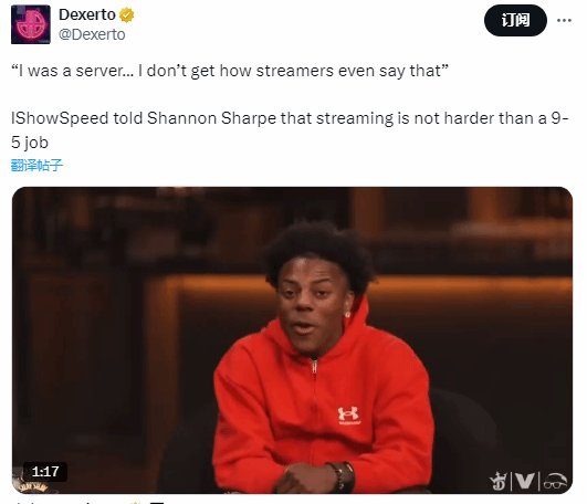 日前,19岁美国知名网红“甲亢哥”IShowSpeed接受一档播客节目采访时,分享了自己对流媒体直播行业的看法。他认为直播相较于朝九晚五的工作要轻松一些。