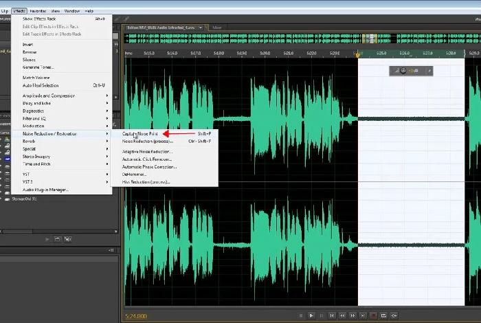 进入Audition选择一段背景噪音区域,然后选择capture Noise Print选项,Audition据此进行降噪。