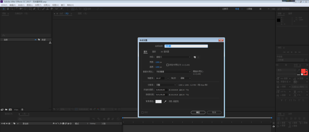 1、打开AE软件,新建一个合成,合成大小可自定,这儿是设为1280*1280
