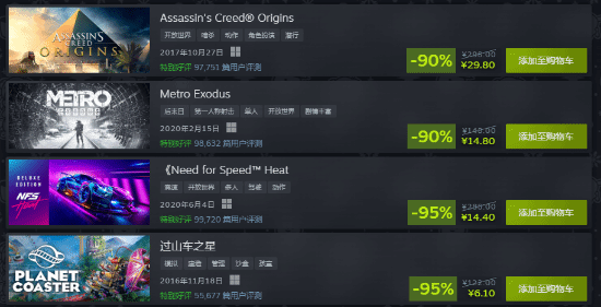 参与优惠的游戏大多为“特别好评”或“好评如潮”评价,有《刺客信条:起源》《地铁:离去》《极品飞车:热度》《泰坦陨落2》《森林》等。