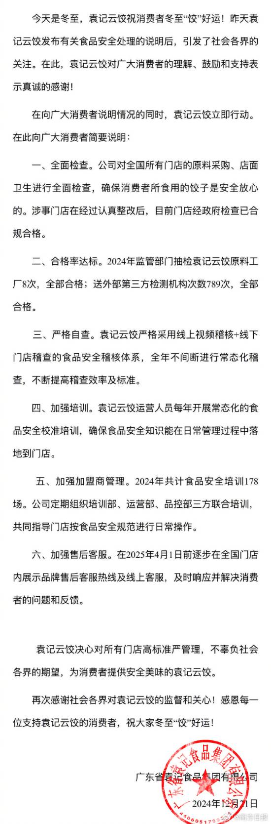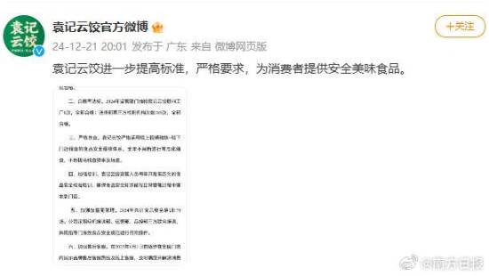 根据最新消息,袁记云饺官方微博发布最新情况说明称,涉事门店在经过认真整改后,目前门店经政府检查已合规合格。