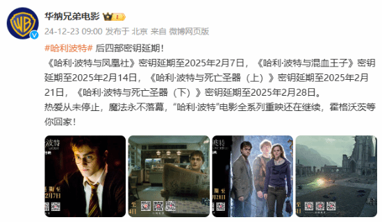 今日,华纳兄弟电影官微官宣,《哈利·波特》后四部密钥延期。