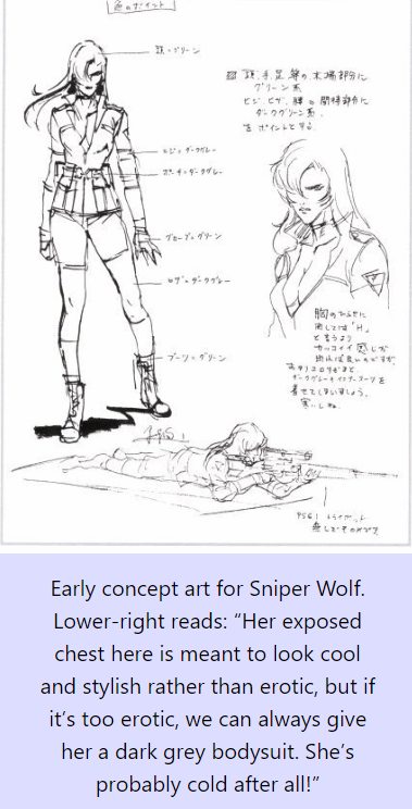 对于这些严格标准的原因,小岛解释道:“我希望通过角色的服装就能看出他们是什么样的人,有什么样的动机。”采访中还展示了一张狙击雪狼的早期概念图,制作人表示图中露出的胸部是为了看起来很酷很时尚,而不是色情。