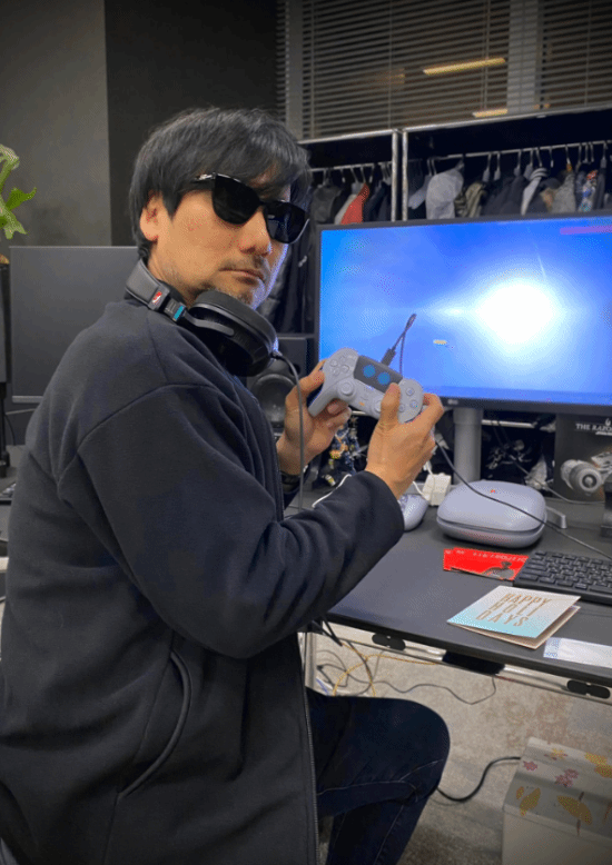 小岛秀夫的推文中写道:“在制作游戏”,并配上一组照片。其中,他戴着一副黑色墨镜,神态专注地盯着显示器屏幕。他手上还握一只《宇宙机器人》特别款PS5手柄。