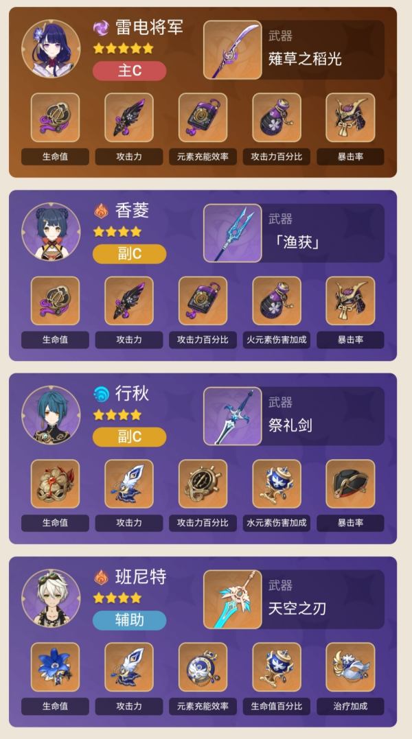 配队一:雷电将军+九条裟罗+班尼特+枫原万叶
