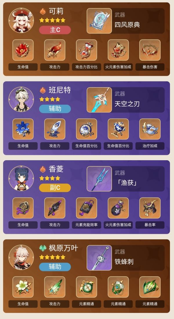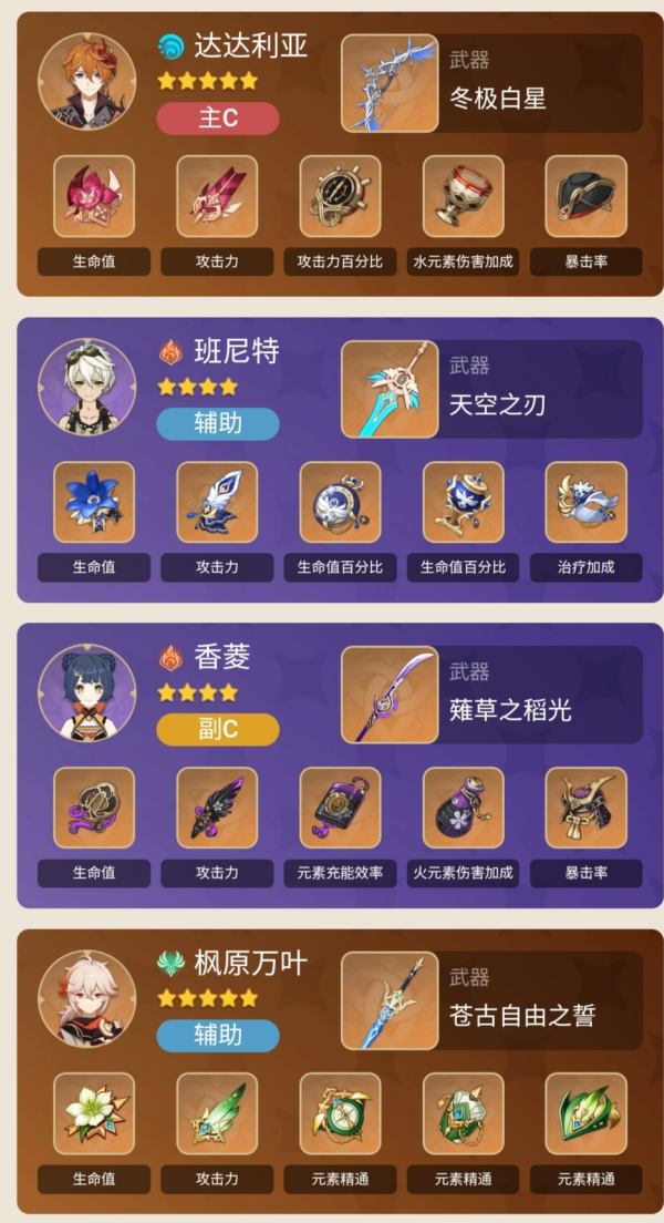 配队一:达达利亚+班尼特+香菱+枫原万叶