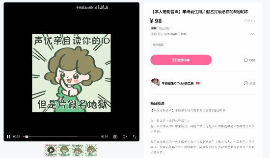 知名声优丰崎爱生近日在B站开设了“本人定制音声”服务,为粉丝带来独一无二的专属体验。该服务定价98元人民币,内容为“丰崎爱生用片假名咒语念你的B站昵称”。