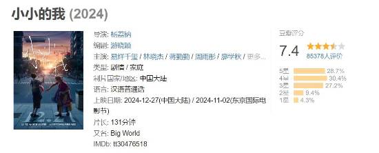 《小小的我》也于今日在豆瓣开分。截至发稿前,共有85378人评价,均分为7.4。有给出中评的观众认为,易烊千玺的表演总有种抽离人物的感觉,太过努力与“原型人物”产生疏远感,跟生活中接触到的这类人群不是很像。