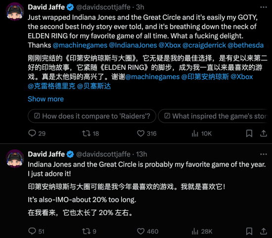 今日,战神初代总监David Jaffe发文称,《夺宝奇兵:古老之圈》是他今年的年度游戏,几乎快要赶超《艾尔登法环了》。他也表示,如果流程能再短些就更好了。