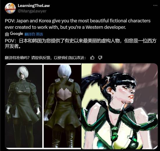 游戏博主LearningTheLaw发布推文,吐槽西方游戏开发者对女性角色的丑化。即使是《尼尔》的2B和《剑星》的伊芙这些公认比较好看的女性角色,在西方开发者的手下也会彻底“变质”。比如伊芙变成“愤怒的女同性恋”,2B变成“身材魁梧的壮汉”。