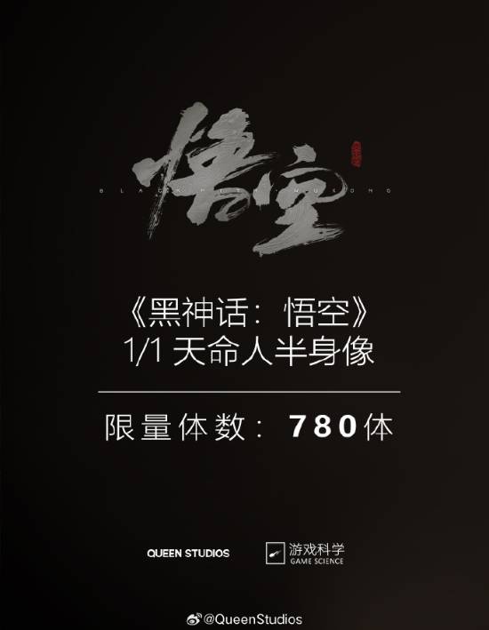 昨日晚间,QueenStudios官方发布消息,《黑神话:悟空》天命人1/1半身像全球限量体数确定为780体。昨日20:00,预定正式截止。