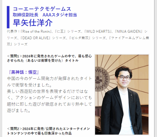 值得注意的是,这次采访中冈村典明并非唯一一个将《黑神话:悟空》选为2024年最令人震惊的游戏的人。来自光荣特库摩和Cygames等工作室的开发人员也有类似的反应。