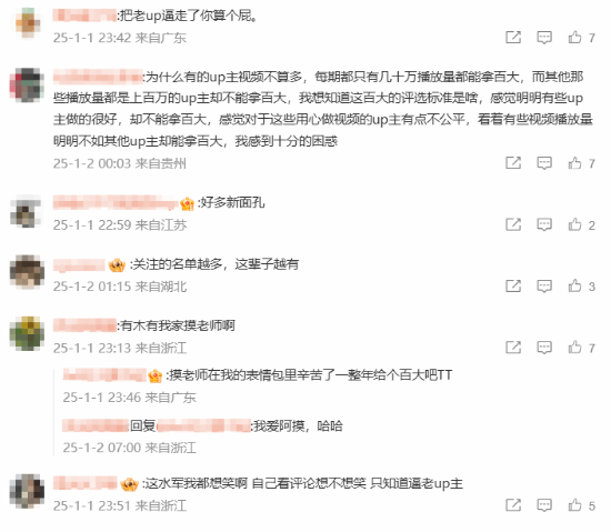 不少网友对包括今年在内的近年百大UP含金量产生质疑:老UP都没了,现在亮相的都是不认识的,呼吁B站今早公开百大的详细评选标准以及数据量化。