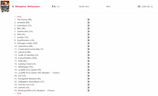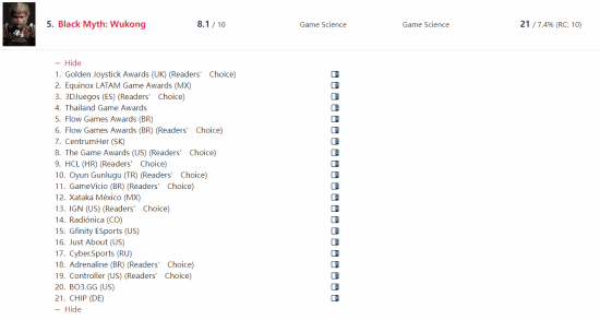 Square Enix《最终幻想7:重生》位列第二,共获得了37项奖项;独立作者LocalThunk打造的《小丑牌》以28项年度最佳位列第三;Atlus《暗喻幻想》排在第四名,共获得了25项年度最佳;国产游戏《黑神话:悟空》排在第五,共获得21项年度最佳奖项。