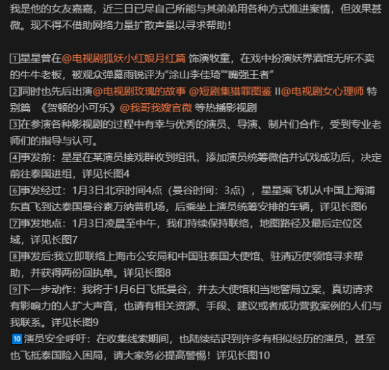 1月5日晚间,星星的女友@失眠爹地发文称星星在赴泰国进组拍戏后,于北京时间1月3日中午12时许在泰缅边境失联。距离双方最后一次发消息已经超过60个小时。