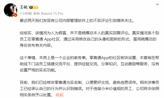 小米公关部总经理王化辟谣:小米零售通上的王晓雁言论为员工冒充发布