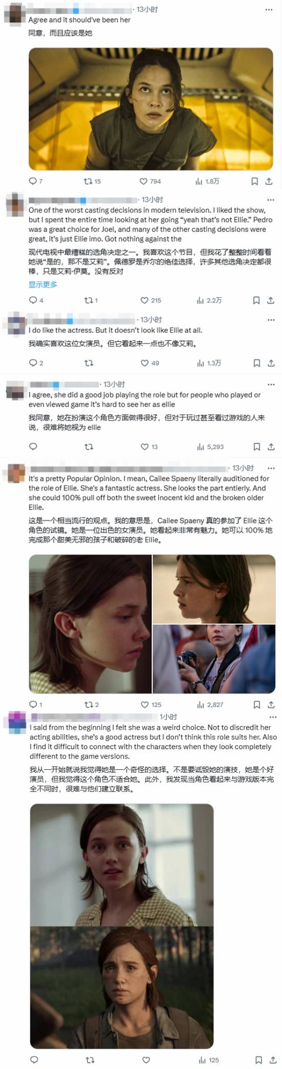 同日,推主@LegacyKillaHD发推转发了由小熊女贝拉·拉姆齐扮演的艾莉与《最后生还者2》游戏里艾莉的对比图,认为HBO应该在第二季剧集里重新选角艾莉。@LegacyKillaHD称,贝拉·拉姆齐在《最后生还者》第一季剧集的表现很不错,但到了第二季,她就不适合艾莉这个角色了。