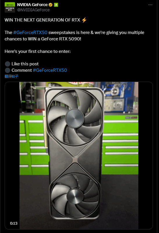 在公开GeForce RTX 50系列显卡后,英伟达立即宣布了一项抽奖活动。NVIDIA GeForce近日在X平台发布了一则帖子,宣布将赠送“多个”GeForce RTX 5090显卡。