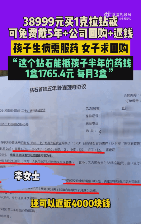据媒体报道,郑州张女士恋爱时花38999元买1克拉钻戒,当时品牌签合同表示免费戴5年,公司可以回购并返钱,如今孩子生病需服药,女子急需用钱,但在回购返钱时遭到拒绝。
