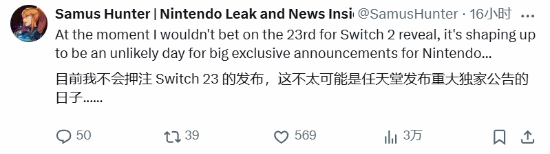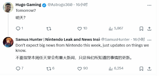 此外,在回应网友询问“明天是否会有消息”时,SamusHunter进一步表示:“不要期待任天堂本周会有重大新闻,只有一些我们已知事情的更新。”