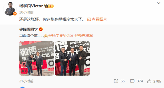 照片中,陈震正向着杨学良鞠躬,头埋得很低。而杨学良在转发微博时也友好表示称他鞠躬幅度太大了,并附上了另外一张图片。网友也在评论区表示:一笑泯恩仇。