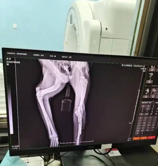 送医后经诊断,多米两条后腿都有伤,一条骨折一条韧带断裂,还伴随肺挫伤等多种症状,情况危急。但幸运的是,经两天抢救以及后续的骨折手术和长达半年的康复,在花掉近两万元医疗费后,多米恢复了健康。