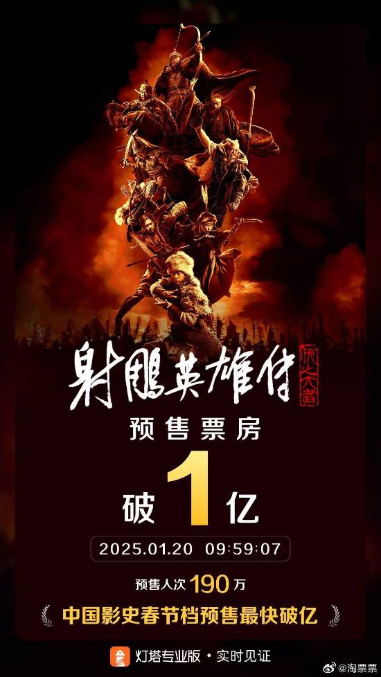 据灯塔专业版实时数据,截至1月20日9时59分,影片《射雕英雄传:侠之大者》预售总票房突破1亿,超过《唐人街探案3》,成为中国影史春节档预售最快破亿影片。