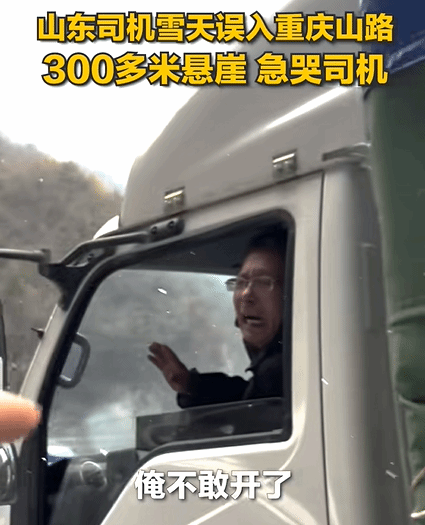 山东一货车司机李师傅到重庆送货,回程的路上误入了重庆山路,因为路边是300多米的悬崖,且当时已经下雪,路面湿滑,李师傅急得抹泪,直说:“不敢开了,不敢开了……”。
