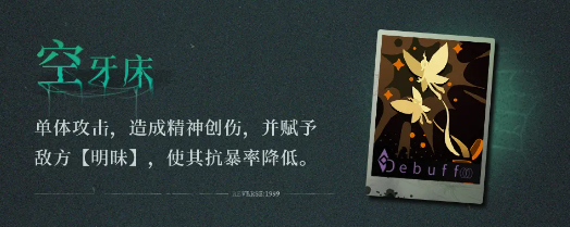 对单体敌人造成精神伤害,是牙仙的BUFF技能,释放时敌人获得DEBUFF[明昧],降低敌人抗暴率。