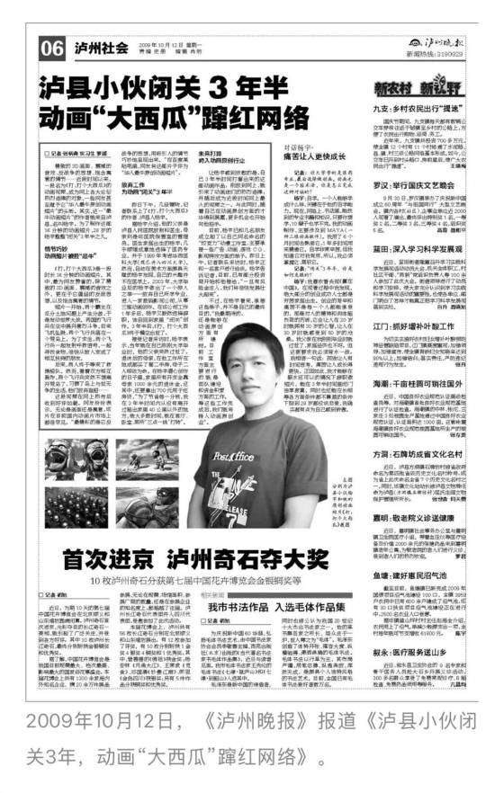 2009年10月,当时饺子刚刚凭借16分钟动画短片《打,打个大西瓜》初尝成名滋味,《泸州晚报》对其进行专访。