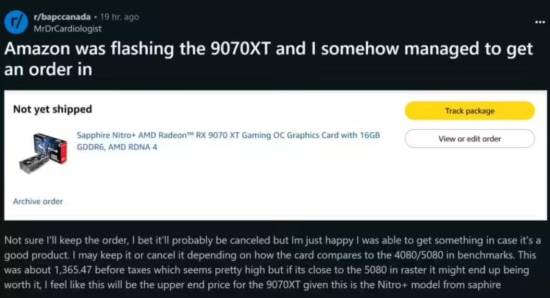 Reddit 用户 bapccanada 发现,蓝宝石超白金 Radeon RX 9070 XT NITRO+ 显卡已经提前在加拿大亚马逊上架了,售价高达 1365 加元(当前约 6993 元人民币),但就算存在溢价还是已经有人果断下单。