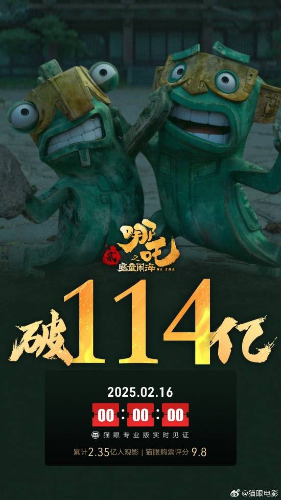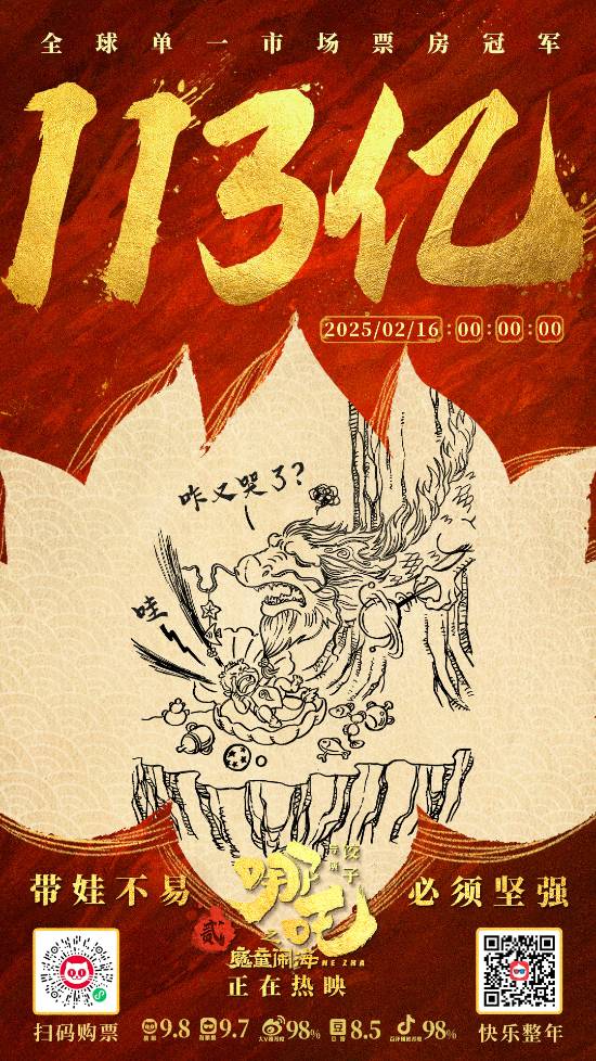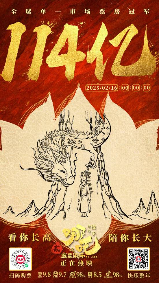 《哪吒之魔童闹海》官方微博也在凌晨连续发布“113亿”、“114亿”两张贺图,庆祝这一里程碑!