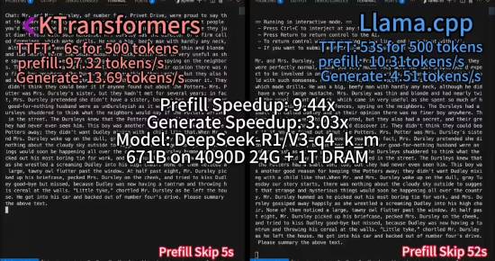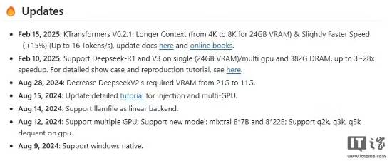 如图所示,KTransformers 团队于 2 月 10 日成功在 24 GB 显存 + 382 GB 内存的 PC 上实现本地运行 DeepSeek-R1、V3 的 671B 满血版,速度提高 3~28 倍。