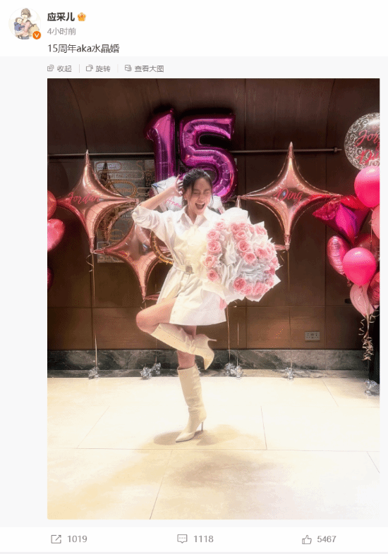 2月15日,应采儿在社交媒体上晒照庆祝与陈小春结婚15周年。她手持一束玫瑰,配文称:“15周年aka水晶婚。”