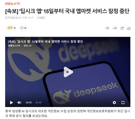 该委员会早在1月31日便向DeepSeek总部发送了有关个人信息收集及处理方式的正式质疑书,据其判断,若想符合《保护法》规定,DeepSeek需要相当长的时间进行整改,遂决定暂停其在韩国应用市场的服务。此次措施实行后,老用户仍可正常使用,但新用户下载将受到限制。