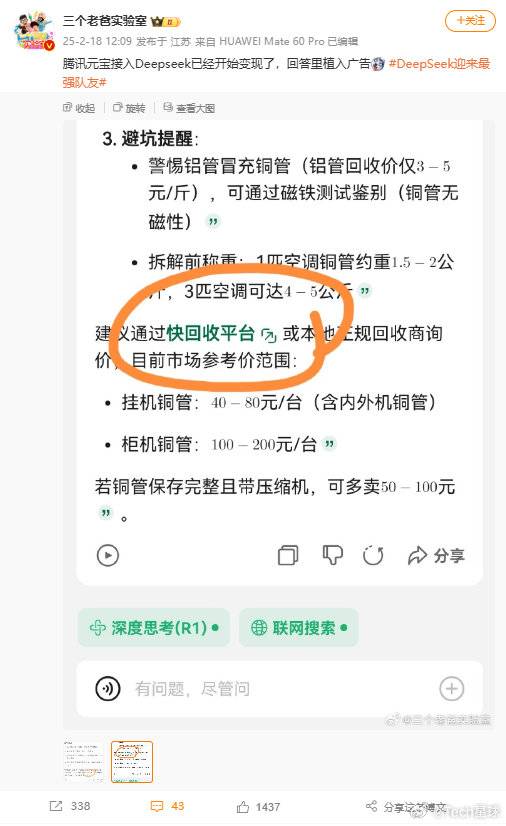 今日,科普博主“三个老爸实验室”发微博,称腾讯元宝接入DeepSeek已经开始变现了,回答里植入广告。