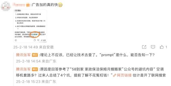 随后,张军称“原因是回答参考了‘58到家 家政保洁保姆月嫂搬家’公众号的避坑内容‘空调移机套路多?过来人总结了4个坑,提前了解不花冤枉钱!’估计是开了联网搜索。”