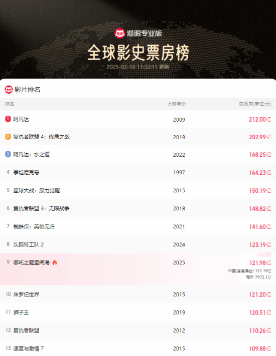 冲进全球影史票房榜前十之后 《哪吒2》即将冲顶全球动画榜!