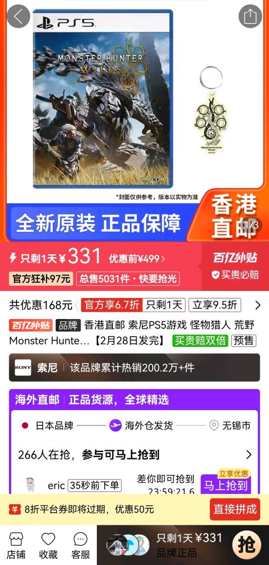 《怪物猎人:荒野》即将于2月28日正式发售,有网友发现,在国内电商平台出现好价《怪物猎人:荒野》PS5光盘+钥匙扣特典,优惠价为331元。不过作为一款可大量反复游玩的“刷子”游戏,光盘版显得没有数字版那么方便。