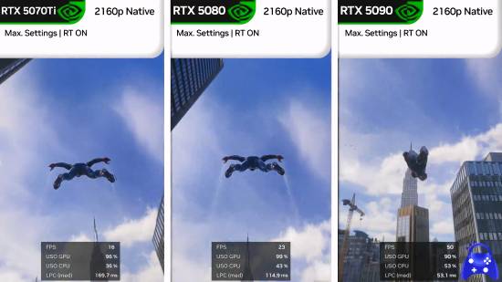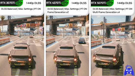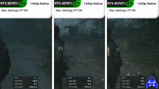 测试发现,在原生2K分辨率(开启光追或路径光追)RTX 5070 Ti较前代显卡的提升并不明显,但依靠DLSS升频技术,游戏帧数可以实现一倍甚至更多的上涨。类似的情况也存在于5070 Ti与更高级的5080、5090显卡对比中。
